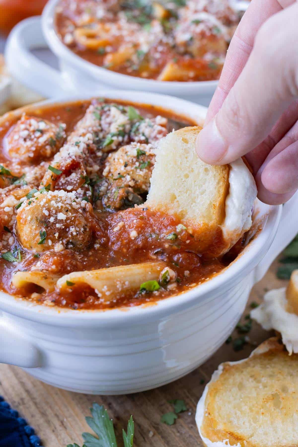 - Pasta: Penne pasta is my favorite for this soup—it’s the perfect size to pair with a meatball in every bite!