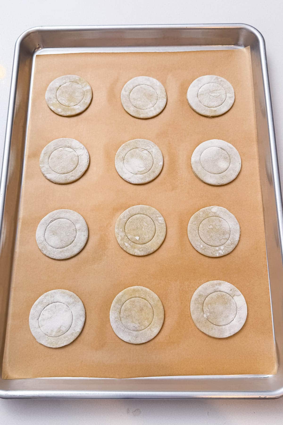 Let the puff pastry soften just until it unfolds without cracking. Lightly flour a cutting board and roll it into a 10 x 12-inch rectangle. Cut twelve 2½ inch circles, then lightly score a ½ inch border inside each one to create a small frame for the filling. (I used this set of round cookie cutters to get clean, even cuts!)