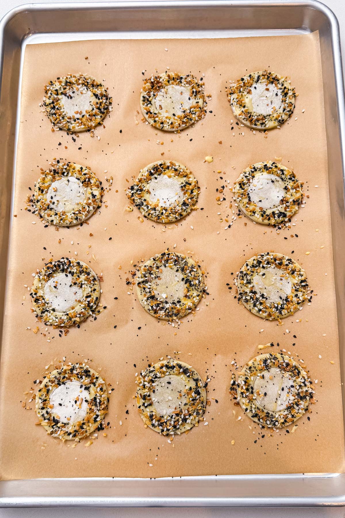 - Place the pastry circles onto the prepared baking sheets, leaving space between each one. Brush the outside edges with the egg wash and sprinkle each with about ½ teaspoon of the everything bagel seasoning.
