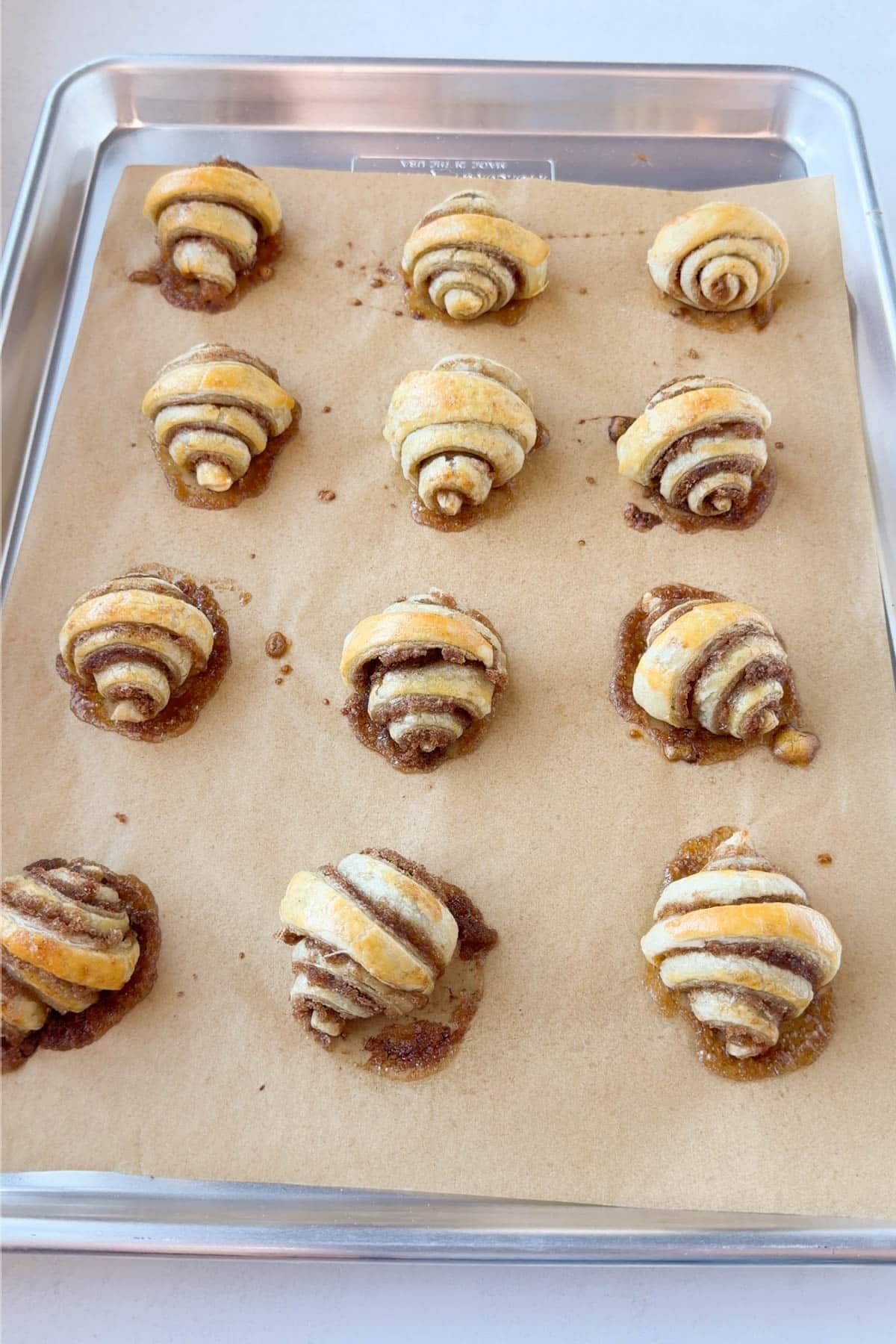 A bunch of the filling leaked onto the pan. A little is totally normal, but if it feels like a lot, the cinnamon sugar may not have been pressed in enough. Gently pressing it into the pastry helps it stay put while baking. If this happens, transferring the croissants to a wire rack right after baking helps keep any melted sugar from sticking.