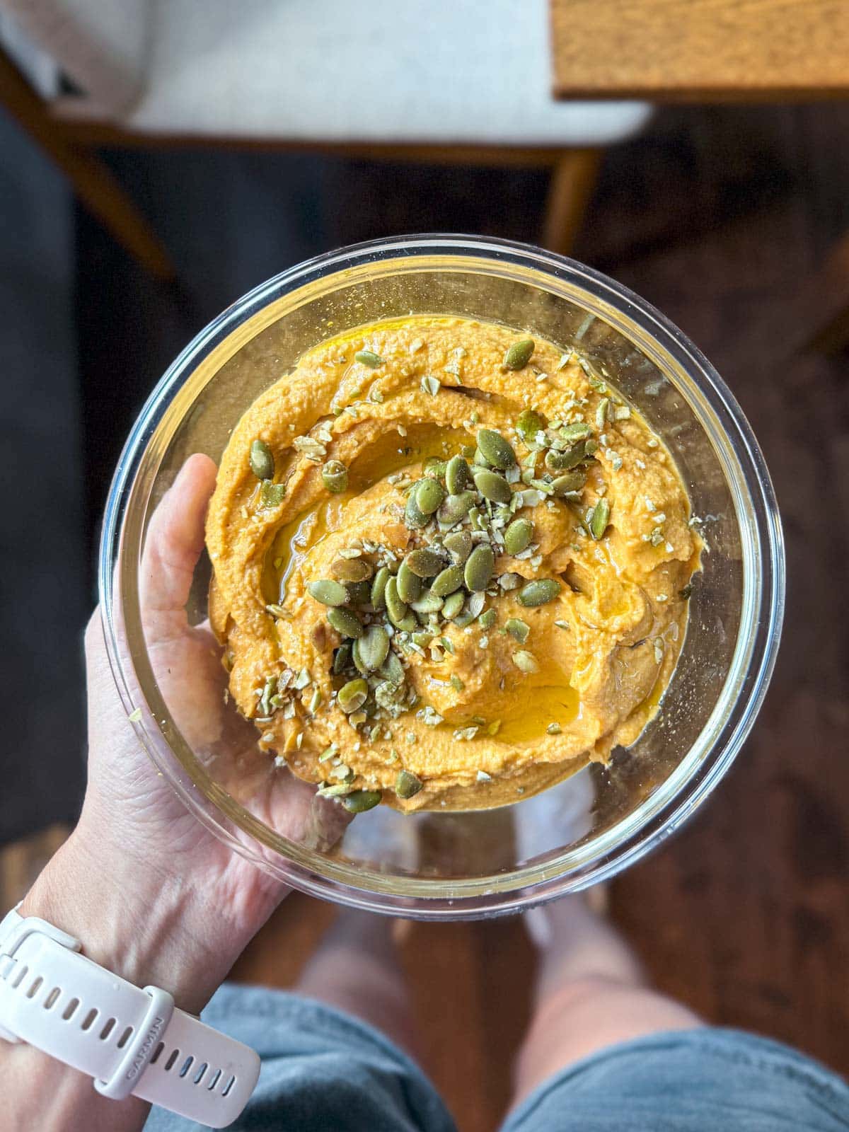 Gradually add water or reserved chickpea liquid, 1 tablespoon at a time, until the hummus reaches your desired consistency. Spoon into a bowl, drizzle with olive oil, and top with roasted pumpkin seeds if you’d like a little crunch!