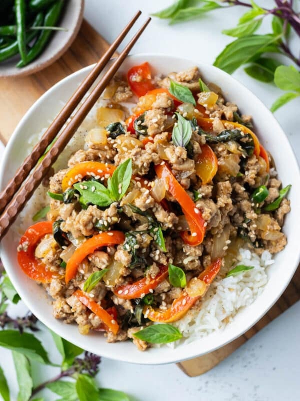 Toss in the Thai basil, give it one more stir, and cook for just 30 seconds. Serve over jasmine rice with toasted sesame seeds and extra basil leaves on top.