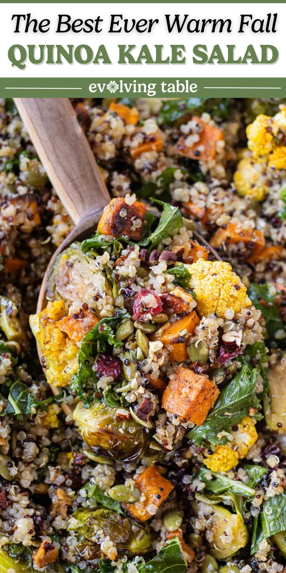 Layer the cooked quinoa and chopped kale in a large bowl. Add the roasted vegetables, dried cranberries, pumpkin seeds, pecans, and goat cheese if using. Drizzle with the vinaigrette and toss gently to combine.