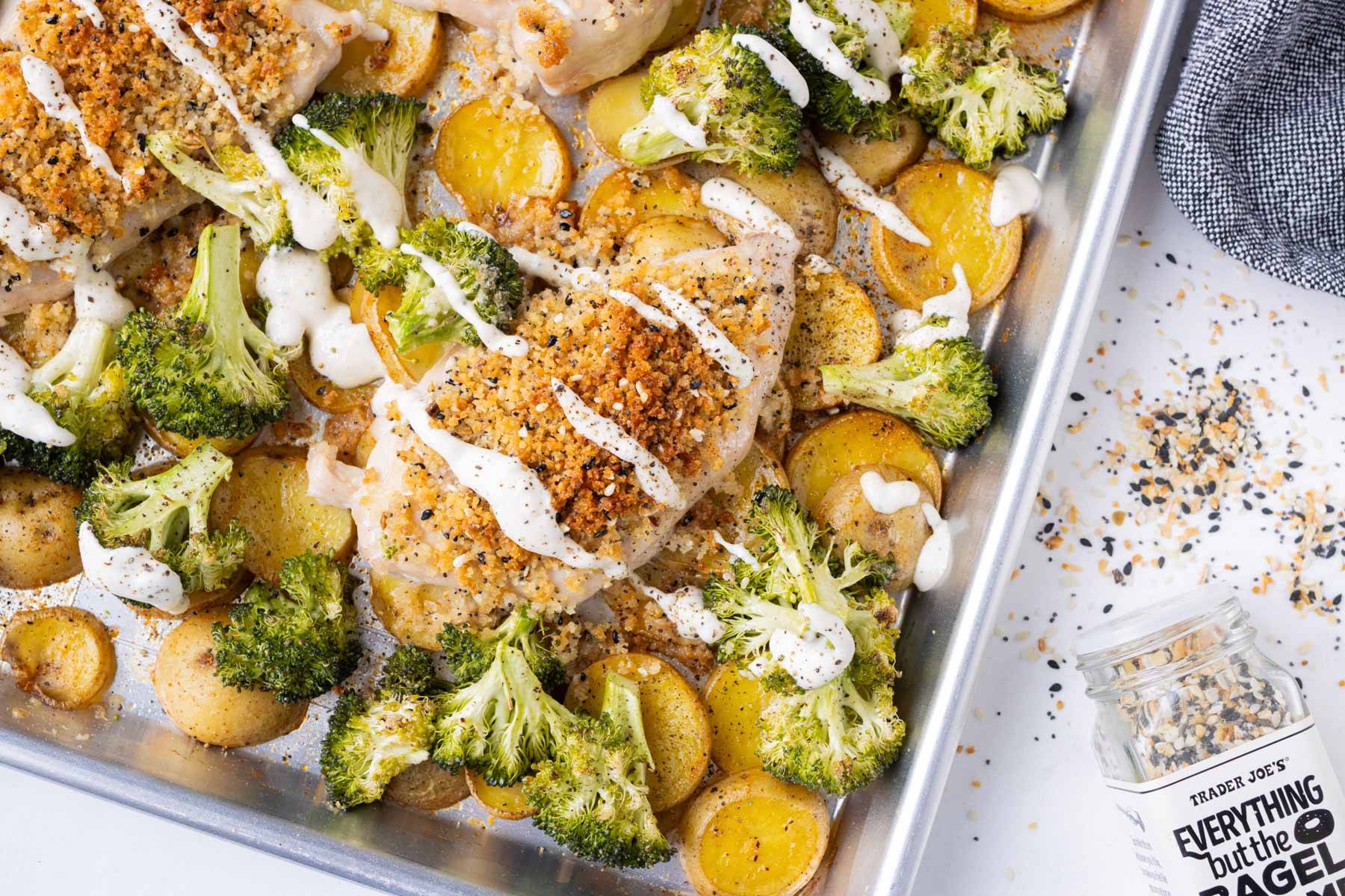 Juicy chicken, tender potatoes, roasted broccoli, and a crunchy everything bagel topping all bake up on one pan, then get finished with a simple 2-ingredient cream sauce that makes it SOOOO good!