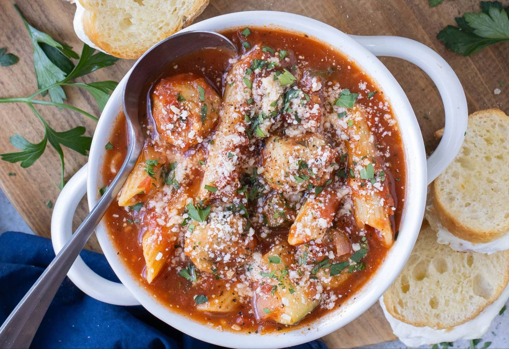 With juicy meatballs, penne pasta, a savory tomato broth, and plenty of parmesan cheese, it’s got all the best parts of Chicken Parmesan in a quick and easy-to-make soup.