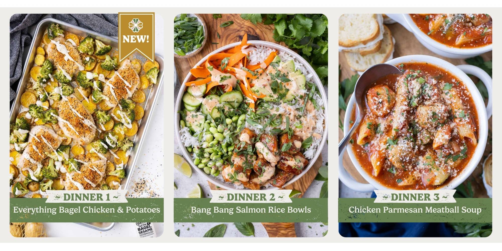 - 3 curated dinners with a mix of cuisines, proteins, and veggies