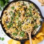 All the cozy green chile enchilada flavor you crave, but made in one skillet in 35 minutes. Tender shredded chicken, black beans, corn, and tortilla chip pieces simmer in a zippy green enchilada sauce, then get blanketed with melty Monterey Jack. No rolling, no baking, no sink full of dishes.